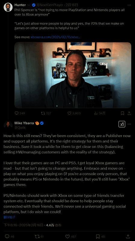 他表示,Xbox团队自始至终都一直是一家发行商,将支持所有平台。他说道:“我喜欢他们的游戏现在也在 PC 和 PS5 上,我知道忠实的 Xbox 玩家很生气——但这不会改变任何事情。只有接受并别再纠结——现在你可以在自己喜欢的设备上玩(如果你只玩主机,那可能意味着将来会用 PS 或任天堂)。但你依然会有‘Xbox’游戏。”