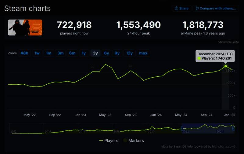 根据SteamDB的数据显示,《反恐精英2》在2月16日创下了自2023年9月上线以来的同时在线玩家峰值数据新记录,达到了1,744,015人,考虑到最近游戏没有什么特别的更新,创下这一记录的具体原因尚不明确。