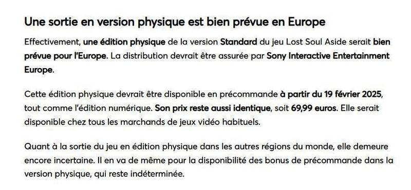 根据知名爆料人billbil-kun的消息称,国产游戏《失落之魂》将在欧洲地区推出PS5实体版,由SIE欧洲负责发行,预计2月19日起开始预购,售价69.99欧元,与数字标准版一致,不过尚不清楚该作的实体版是否会在全球其他地区发行。