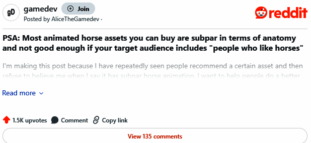 ·AliceTheGamedev日前在reddit发帖,怒斥Horse Animset Pro(HAP)正在被广大游戏厂商所应用,实际上完全不符合真实马的动作,呼吁游戏开发商别吝啬成本,用心真正重视真实马的表现。