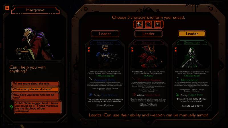 一小群漂浮在虚空中的幸存者在地球最后的残余地之一建立了定居点。从大量名单中选择三人组建你的小队。每个幸存者都拥有独特的主武器,以及升级树和特定的属性奖励。提拔其中一人带领小队获得他们在本次探险中的特殊能力。