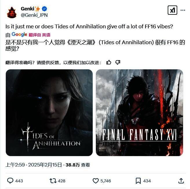 不过,今日,日本推主@Genki_JPN发推认为《湮灭之潮》这款游戏和SE的《最终幻想16》很相像。
