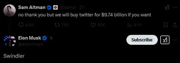 然而,该事件在11日发生了戏剧性转折。OpenAI的首席执行官奥尔特曼在社交媒体X上发帖称:“不了,谢谢。但如果你愿意的话,我们可以花97.4亿美元收购推特。”