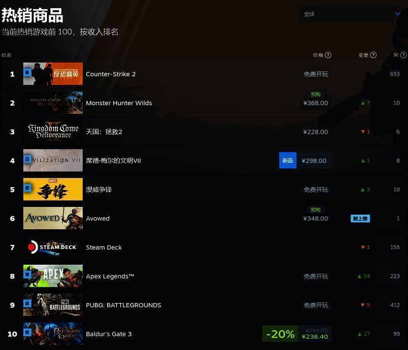 截至稿时,游戏位居 Steam 全球范围畅销榜第 6 名,美国畅销榜第 3 名。不过在国内,游戏并没有获得太多关注,排名第 36 位。全球榜登榜游戏包括了最近的热门新作,例如《文明7》、即将推出的《怪物猎人:荒野》,以及热门的持续运营游戏,例如《漫威争锋》、《Apex英雄》,以及登顶的《CS2》。