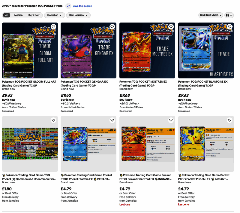 根据 The Gamer 报道,热门手机游戏《精灵宝可梦TCGPocket》的一些卡牌已经出现在了交易平台 eBay 上,而通过游戏外进行卡牌交易或是售卖卡牌是违反游戏用户守则的。