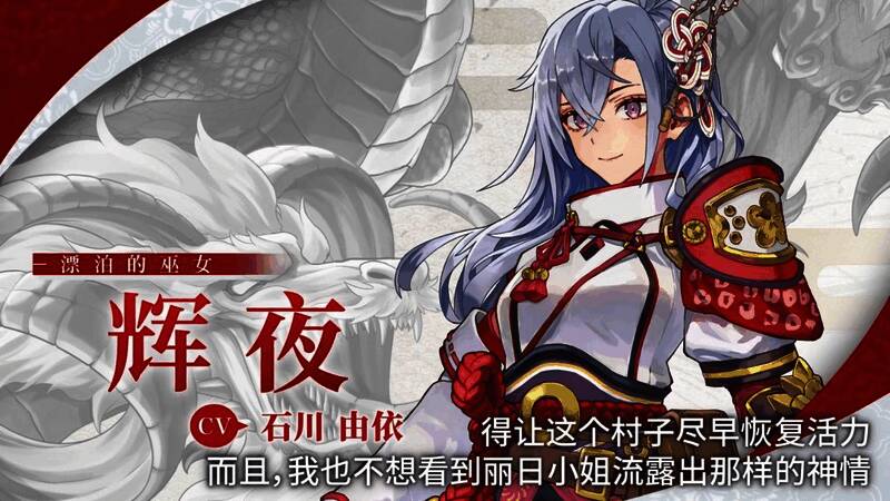 “辉夜”出身自东国北方的贫困村庄,与男主“昴流”是同乡的青梅竹马。是一名肩负拯救东国使命的巫女。喜欢与大自然中的动物和花草嬉戏、交谈。平时个性沉稳,但面对违背道义的行为时,会展现出固执己见的一面,对不公不义之事感到愤愤不平。