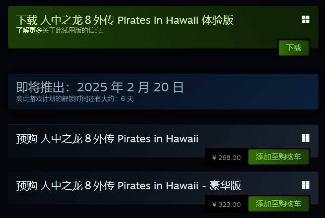 2月14日,《如龙8外传》试玩Demo现已正式上线,适用于PS5、Xbox Series X|S和Steam,该体验版在夏威夷街道的基础上,以本作首次登场的秘密孤岛“狂热兰蒂斯”为舞台,供玩家体验使用“狂犬”“海盗”这两种风格来战斗的焕然一新的战斗动作,海盗们争相竞技的舞台“海盗斗技场”及一部分娱乐场所。