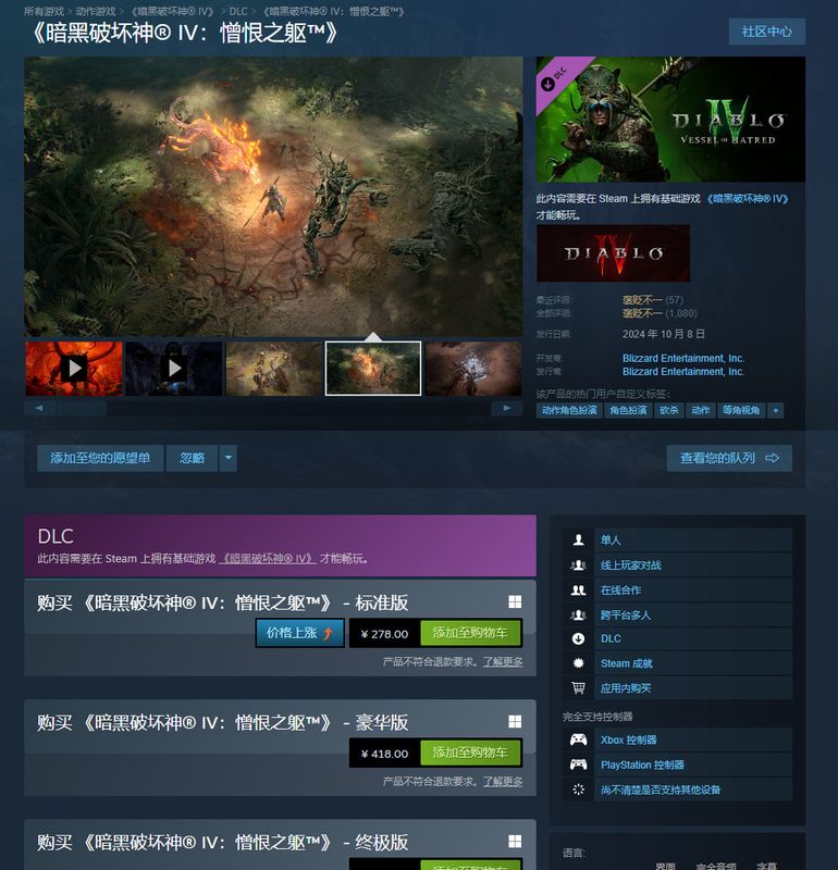 暴雪在去年10月推出了首个资料片“憎恨之躯”,Steam国区标准版278元,带来了新职业灵巫,新功能(符文之语、全新PvE合作终局活动黑暗堡垒),新地区纳罕涂,新的佣兵。