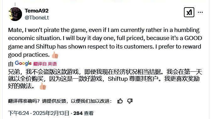 “星弟,我不会玩盗版,虽然我现在手头很紧。我会买首发,全价,因为这是一个好游戏,Shiftup非常尊重玩家。这么好的厂商干嘛不奖励呢?”
