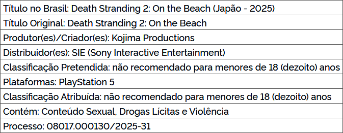 继在韩国获得评级之后,《死亡搁浅2:冥滩之上》又在巴西获得了评级,级别为18+。此前,小岛工作室已经宣布将于3月10日在西南偏南电影节2025上举行《死亡搁浅2:冥滩之上》的特别座谈会,届时小岛秀夫将公布游戏的全新情报,考虑到该作已在多个地区过审,到时候可能会正式公开游戏的发售日期。