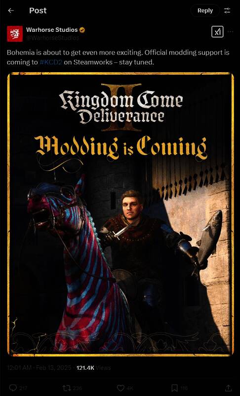 在2月4日正式发售的中世纪背景角色扮演游戏《天国:拯救2》,算得上是2025年的开年大作。而在游戏发售仅仅一周后,官方又宣布了一个好消息,那就是游戏将提供官方MOD支持功能。