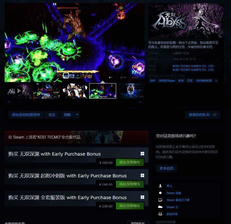 在今早的「State of Play」发布会上,光荣公布了肉鸽无双动作游戏《无双深渊》,该作现已在PC Steam,PS5,PS4,Switch,Xbox Series X|S平台发售。Steam国区标准版169元。