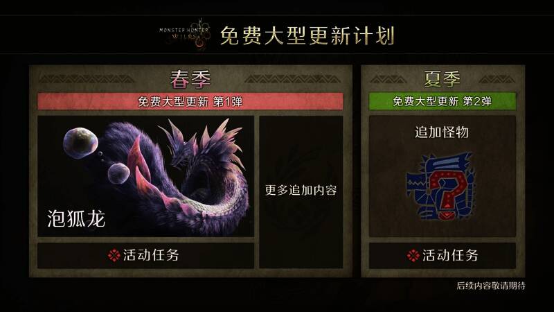 除此之外,卡普空还计划在游戏发售后提供免费更新支持,首个免费更新将回归怪物“泡狐龙”,预计2025年春季上线,第二弹免费更新将于2025年夏季上线,依旧会追加一只新怪物。