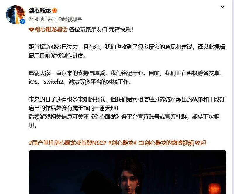 正月十五元宵节,网易公开了新作《剑心雕龙》的首个宣传视频,以展示游戏当前的制作进度。除了祝福玩家外,视频还首度让玩家一窥该作的视觉风格,确认是仙侠世界设定,登陆安卓,iOS,鸿蒙,Switch2等移动端平台,官方称之为暗黑仙侠ARPG便携单机体验。