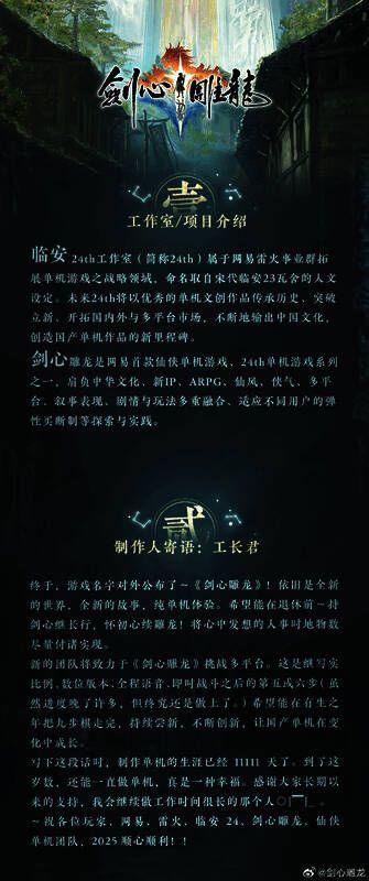 《剑心雕龙》由网易雷火事业群旗下临安24th工作室负责开发,工长君担任制作人,收费模式为弹性买断制。