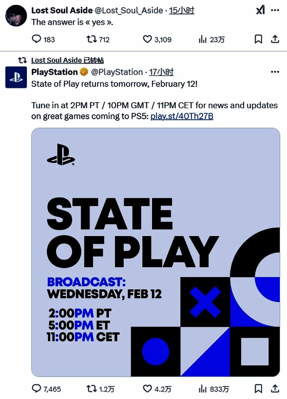 近日,索尼宣布了将于北京时间2月13日早上6点举行新一期State of Play直播的消息,之后国产动作游戏《失落之魂》在X上转发了索尼的直播公告,并在新推文中写道:“答案是肯定的”,这或许是暗示了游戏将在State of Play直播中亮相,该作此前已经确定将于2025年发售,登陆PS5和PC。