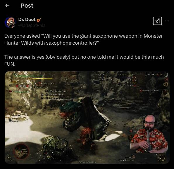 “Dr.Doot”在其推特上如此说道:“每个人都问‘你会使用带有萨克斯管的控制器在《怪物猎人:荒野》中操作巨型萨克斯武器吗?’答案是肯定的(显然),但没人告诉我它会这么有趣。”