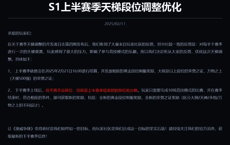 这引发了许多玩家的担忧,因为半个赛季进行重置,第二赛季开始还要再降 6 个级别,这让玩家感觉他们辛苦打出的分段没有意义,自然很多人表达了自己的不满。对此,官方日前宣布将取消半赛季的排位重置。