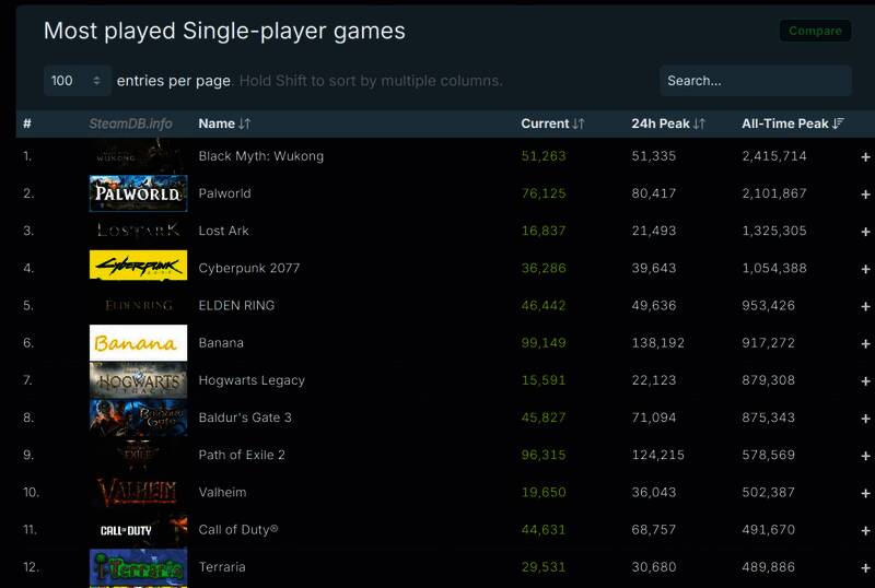 《霍格沃茨之遗》在Steam游玩最多的单机游戏中位列第七