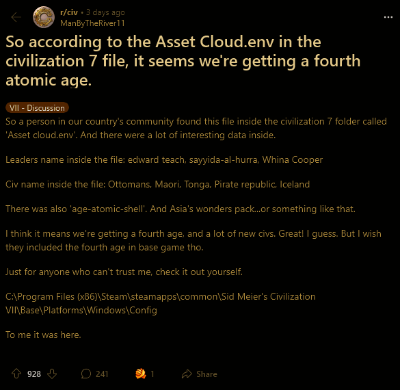 目前游戏中包含 3 个时代:古代、探索时代和现代。在这些时代后游戏就会结束。根据一位 Reddit 论坛用户数据挖掘发现,第四个时代:原子时代。而挖掘出来的一些新的领导人包括“黑胡子”EdwardTeach、Sayyidaal Hurra 以及 Whina Cooper。一些新的文明则包括冰岛、毛利,以及“海盗共和国”(历史上真实存在的,由包括黑胡子在内的一众著名海盗建立,并非真正的国家)。