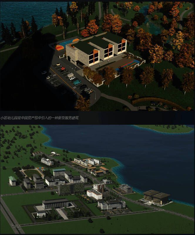 我们注意到,现代中国住宅小区的规划中几乎都包括一所幼儿园。幼儿园是中国城市小区的基本组成部分,通常设在拥有专用设施的独立建筑中。然而,游戏中的教育系统从小学开始,所以我们必须创造性地设计幼儿园在游戏中的运作方式。因此,我们推出了一种新型服务建筑——属于行政类别的现代风格幼儿园。它可以提高800米范围内的福祉,并促进户外文娱——非常明确地展现市民的孩子得到了很好的照顾!