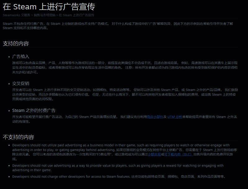 V社新规表示,虽然Steam允许交叉促销和广告植入,但不允许强迫玩家观看或参与广告才能玩游戏。开发商也不应将广告作为“向玩家提供价值的方式,例如给予玩家观看或参与游戏中广告的奖励”。