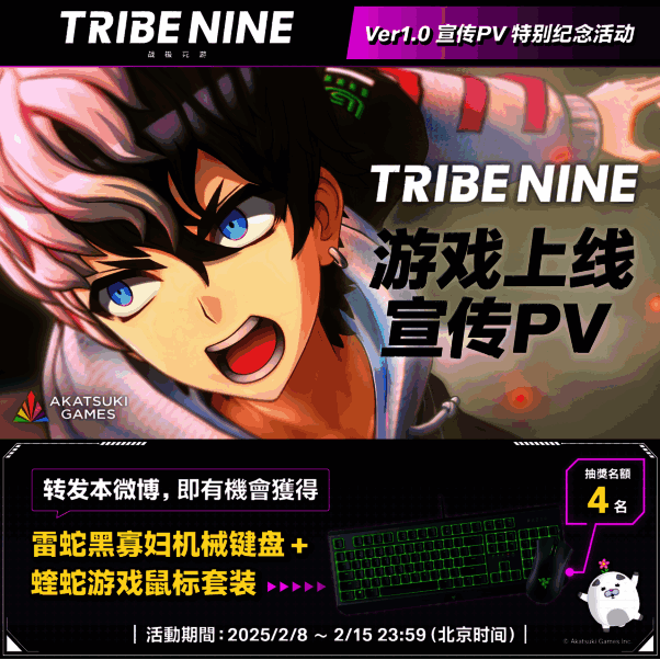 Akatsuki Games Inc.(本社:东京都品川区,代表董事兼CEO:戸冢佑贵,为日本Akatsuki Inc.全资子公司)与Too kyo Games (本社:埼玉县所泽市、代表董事兼CEO:小高和刚)共同打造的“TRIBE NINE”企划,其正在开发中的同名游戏“TRIBE NINE:战极死游”(以下简称 “战极死游”)于 2 月 8 日的官方节目中正式宣佈,游戏将于 2025 年 2月 20 日全球上市。