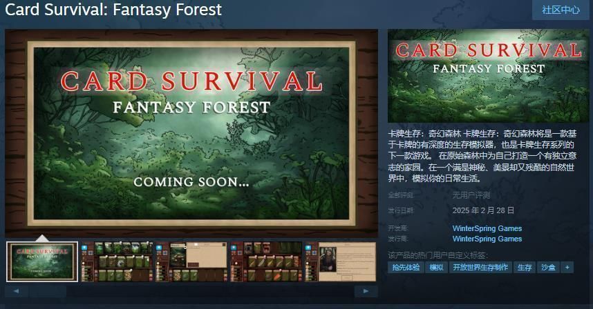 今日(2月10日),基于卡牌的有深度的生存模拟器《卡牌生存:奇幻森林》发售日公布,暂不支持中文,预计于2025年2月28日发售,感兴趣的玩家可以点击此处进入商店页面。