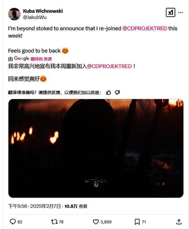 Jakub Wichnowski于2025年2月重新加入CDPR,至今在波兰华沙CDPR总部开发《巫师4》。