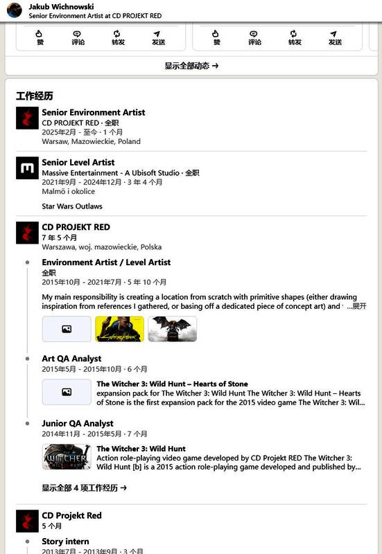领英简历显示Jakub Wichnowski曾在CDPR任职8年左右,2013年5月加盟了CDPR,先后做过市场实习生、故事实习生、初级QA分析师,美术QA分析师、美景美工\关卡美工,2021年7月离开。随后于2021年9月加盟了育碧Massive工作室,担任高级关卡美工,任职3年4个月。