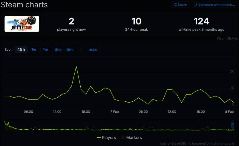 虽然《芯球争霸》是免费游戏,但据SteamDB数据显示,其玩家数量非常少,Steam同时在线峰值仅为124人。该作在Steam上评论数也不多,只有333条,总评为“褒贬不一”。