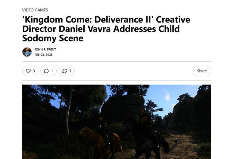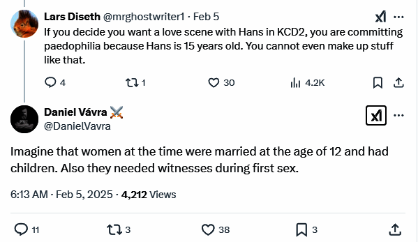 X上一名用户Lars Diseth批评创意总监Daniel Vavra:“如果你决定你想在2代游戏中加入和汉斯的爱爱场景,那么你就犯了恋童癖,因为汉斯只有15岁。你怎么能这么瞎编呢。”