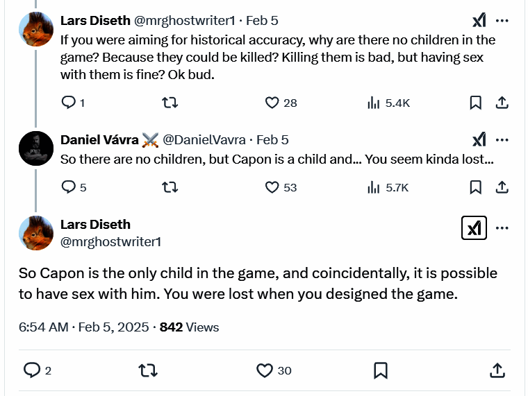 Lars Diseth反驳说:“如果你是为了追求历史的准确性,为什么游戏里没有孩子?因为他们会被杀死?杀了他们不好,但和他们爱爱就没事?好吧,老兄"。
