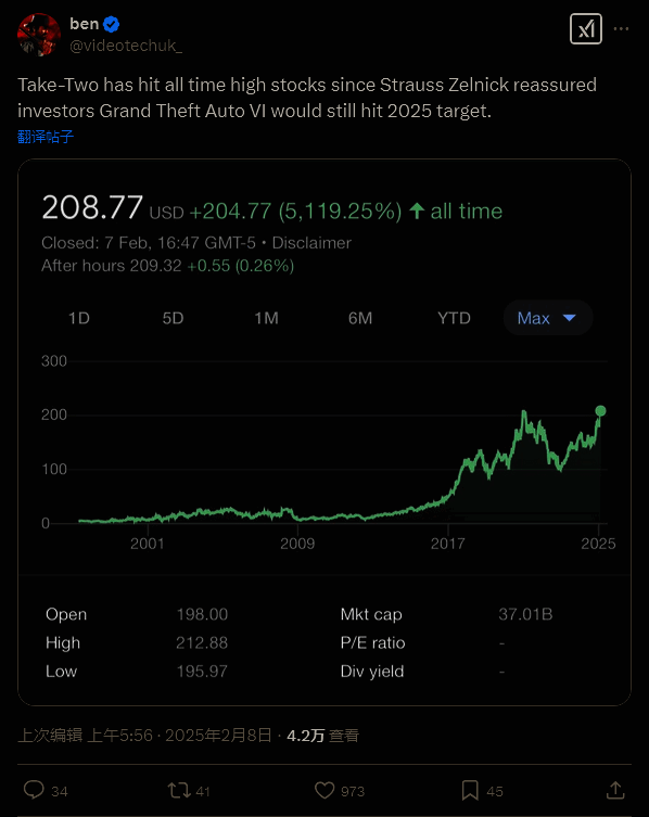 R 星母公司 Take-Two 首席执行官 Strauss Zelnick 最近在公司第三季度的财报会议期间,重申了《GTA6》将于 2025 年秋季发售的消息。作为最受期待的游戏,这显然大幅提高了股东们的信心。据网游发现,在此之后公司的股价攀升,并最终创下新高。
