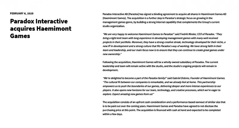 游戏发行商 Paradox Interactive(以下简称P社)宣布,将收购开发工作室 HaemimontGames。这次收购使得改工作室完全成为 P 社旗下子公司。