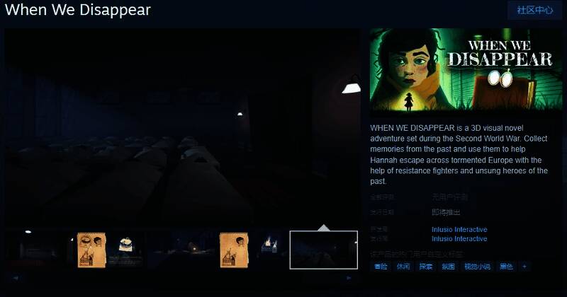 《WHEN WE DISAPPEAR》是一款基于真实事件的气氛浓厚的3D视觉小说冒险游戏。游戏融合了电影、漫画和戏剧叙事手法,以及冒险游戏的历史。它讲述了战争时期孩子们的视角,关于脆弱的希望和过去那些无名英雄的故事。