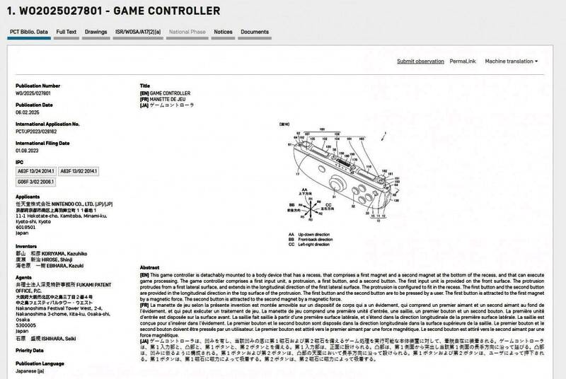 据了解任天堂在2023年8月1日提交了这些围绕着Joy-Con手柄的专利,并在2025年2月6日得到了审批。专利主页的简略说明提到的是Joy-Con全新的磁吸式连接方式,说明中提到:“该游戏控制器可拆卸地安装在具有凹槽的主体设备上,该凹槽包括第一磁铁和凹槽底部的第二磁铁,可以执行游戏处理。”