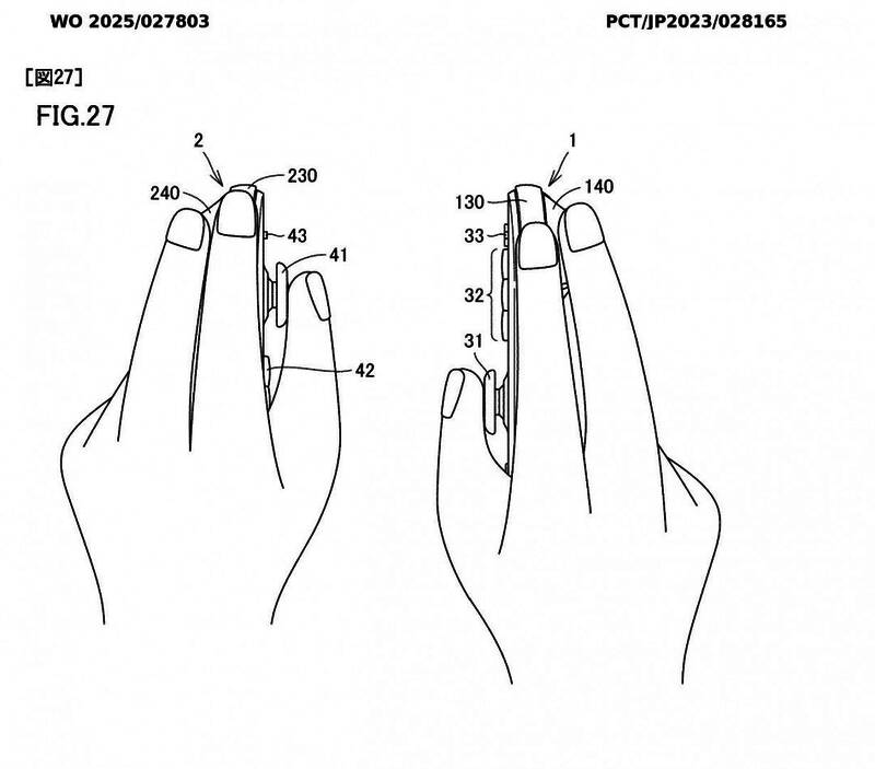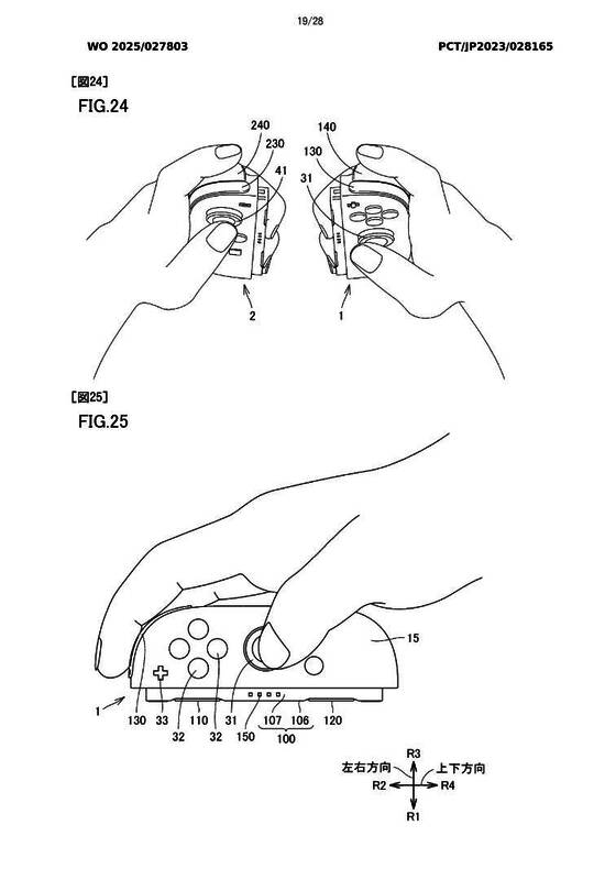此外专利中还展示了能将Joy-Con类似于鼠标那样来使用的新功能,玩家通过侧握Joy-Con、拇指接触摇杆、食指和中指点击顶部R或L的两个按键来实现相关功能。