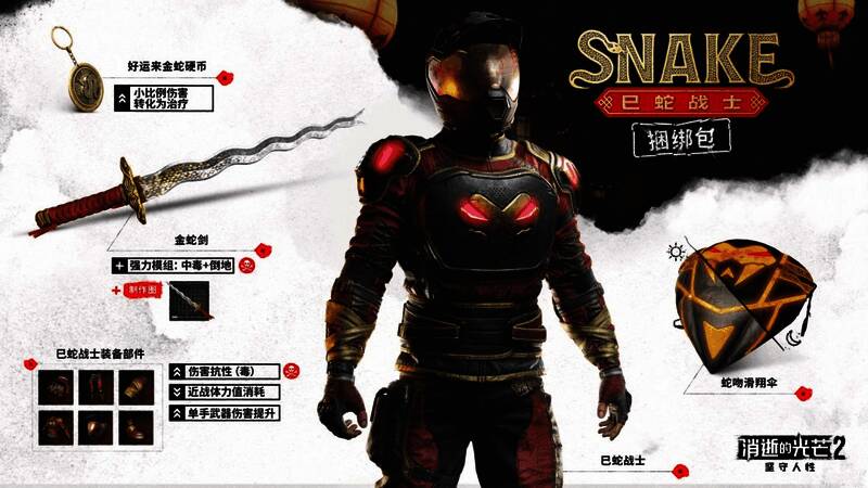 玩家可通过漫游者哨站兑换全新蛇年奖励“巳蛇战士捆绑包”,内含巳蛇战士套装、金蛇剑、好运来金蛇硬币、巳蛇战士装备部件。此前的新年物品“月兔面具”“祖龙之刃”等也返场,可用代币兑换。