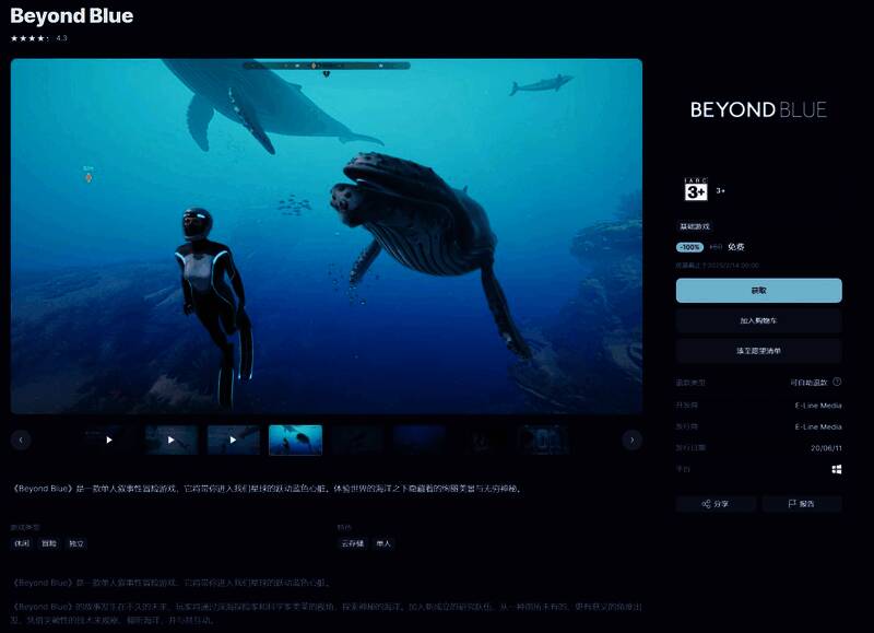 《超越蔚蓝》2020年6月发售,Epic国区原价60元,支持简体中文,游戏在Steam上的评价为“特别好评”。