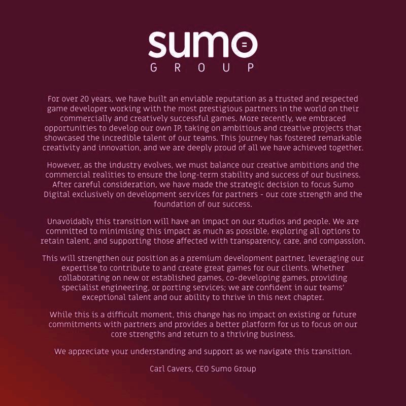 曾开发了《麻布仔大冒险》、《德州电锯杀人狂》,并于去年 9 月推出了《DeathSprint66》的游戏公司 Sumo Group 最近宣布,将重新调整公司业务,未来将“专注于为合作伙伴提供开发服务”。这导致了公司最新的重组,以及可能的裁员。