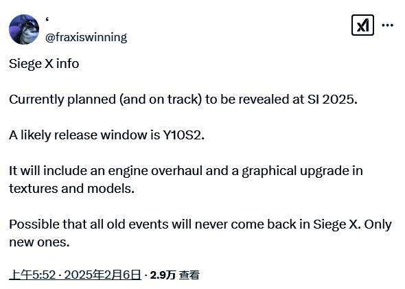 根据《彩虹六号:围攻》玩家社区知名爆料人fraxiswinning的最新推文声称,育碧计划在《彩虹六号:围攻》2025年Six Invitational国际邀请赛上公布续作《彩虹六号:围攻2》(据称该作的名称为《彩虹六号:围攻X》),该赛事将于2025年2月14日至2月16日举行,这是《彩虹六号:围攻》一年中最大的赛事,育碧通常会在活动上公布游戏的下一年更新计划。