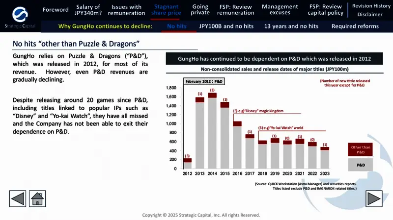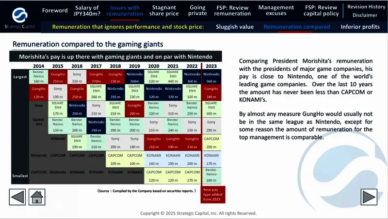 近日投资咨询公司Strategic Capital代表公司股东提交了一份报告,指出《智龙迷城》开发商Gung Ho的总裁薪资过高,但旗下游戏的营收却逐年下滑,相对的投资回报率过低。