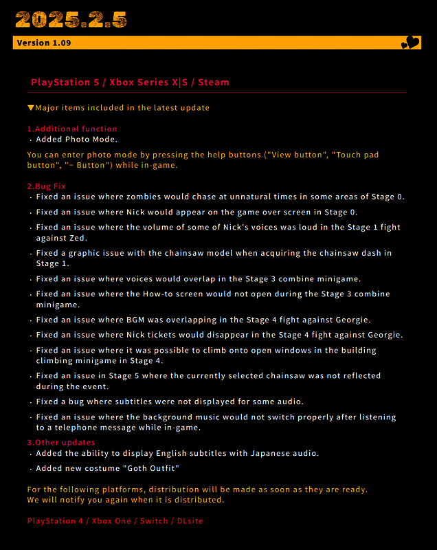 2月6日,《电锯甜心RePOP》发布了1.09版本更新,适用于PS5、XBox SeriesX|S和PC,“照片模式”和新服装“哥特服”现已正式上线,PS4、Xbox One和Switch版更新将在准备完成后立刻发布。