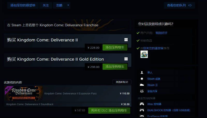 《天国:拯救2》Steam现已推出,国区标准版228元,黄金版298元,自带简体中文,没有D加密。首发一天,Steam上累计近3000条评价(2874),好评率高达93%,为“特别好评”。