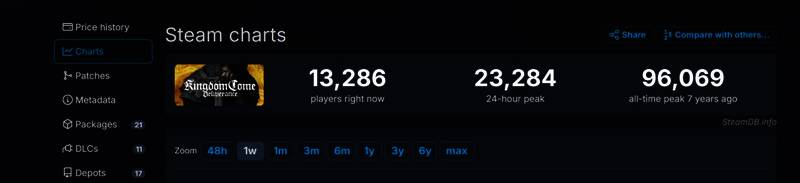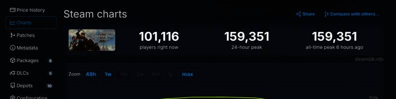 在线人数方面,《天国:拯救2》Steam同时在线玩家接近16万(159351),是1代游戏《天国:拯救》(96069)的1.65倍。