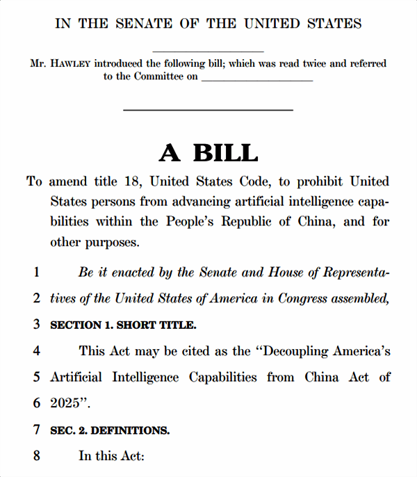 快科技今日(2月4日)消息,据媒体报道,美国国会近日提出了一项名为《2025年美国人工智能能力与中国脱钩法案》的新法案。