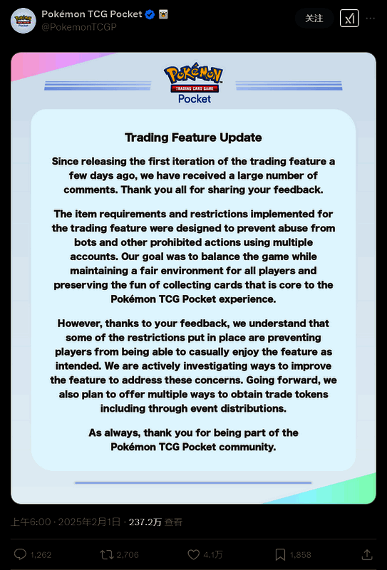 “为交易功能实现的项目要求和限制旨在防止机器人滥用和使用多个帐户进行其他违禁操作。我们的目标是平衡游戏,同时为所有玩家保持一个公平的环境,并保留收集卡片的乐趣,这是《宝可梦TCGPocket》体验的核心。”