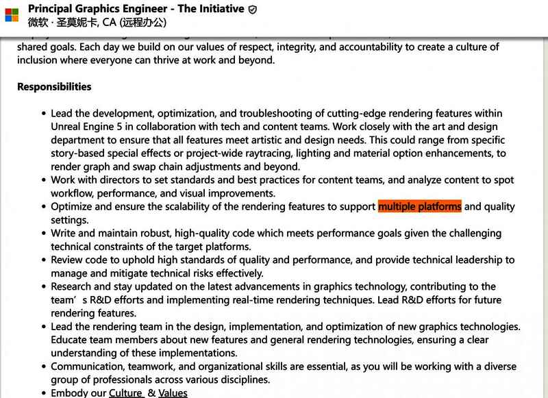 根据《完美黑暗:重启版》开发商The Initiative在领英上发布的“首席图形工程师(远程办公)”职位招聘广告,其中提到“优化并确保渲染功能的可扩展性,以支持多平台和质量配置”。这意味着《完美黑暗:重启版》将支持在多平台游玩。