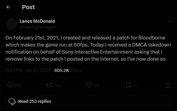 虽然这一MOD满足了部分对帧率追求的玩家的需求,但PlayStation方面似乎并不乐意由第三方未经同意的改动游戏,McDonald在推文中提到:“今天我收到了索尼互动娱乐的DMCA删除通知,要求我删除我在网上发布的补丁链接,所以我现在就这么做了。”